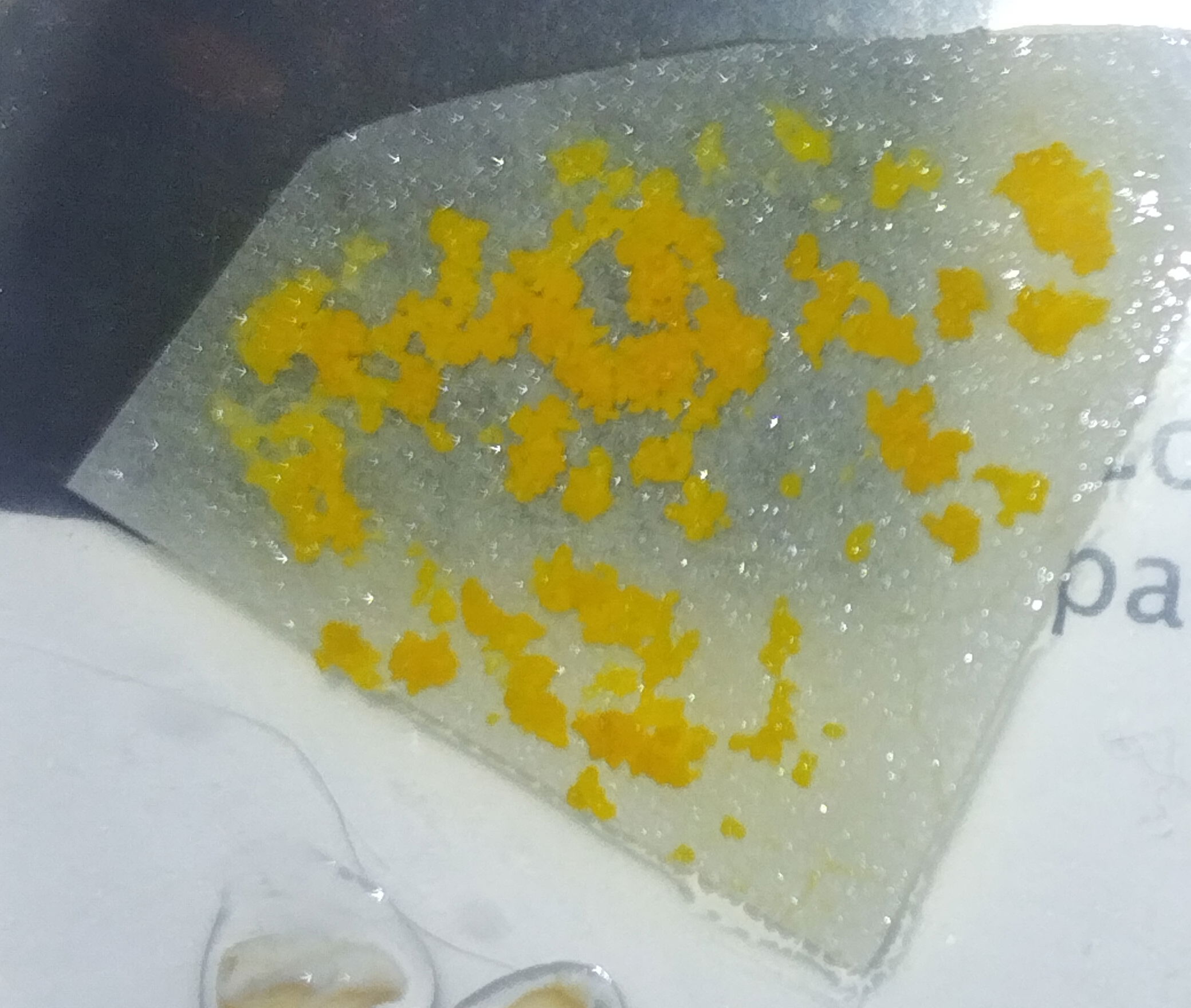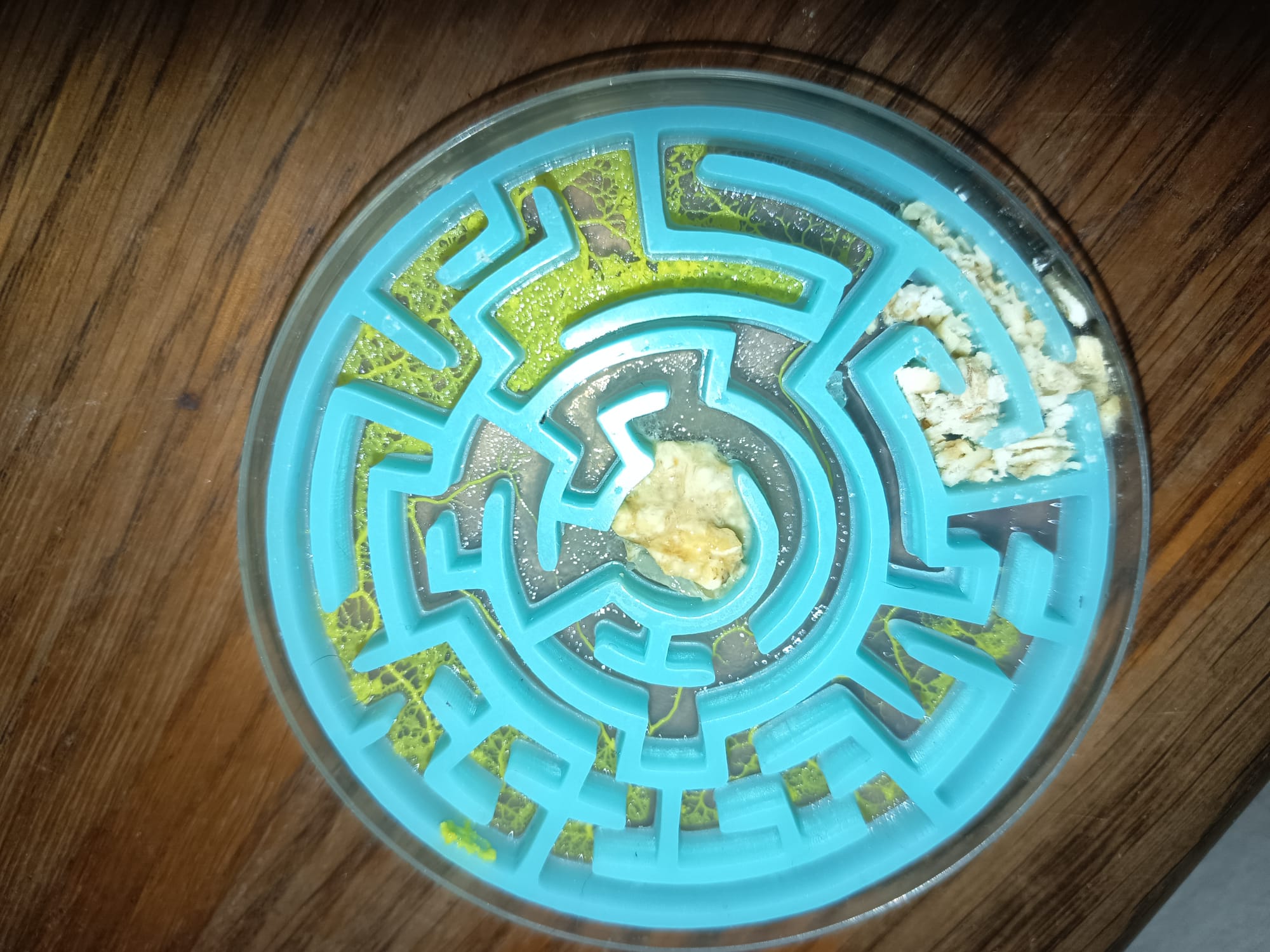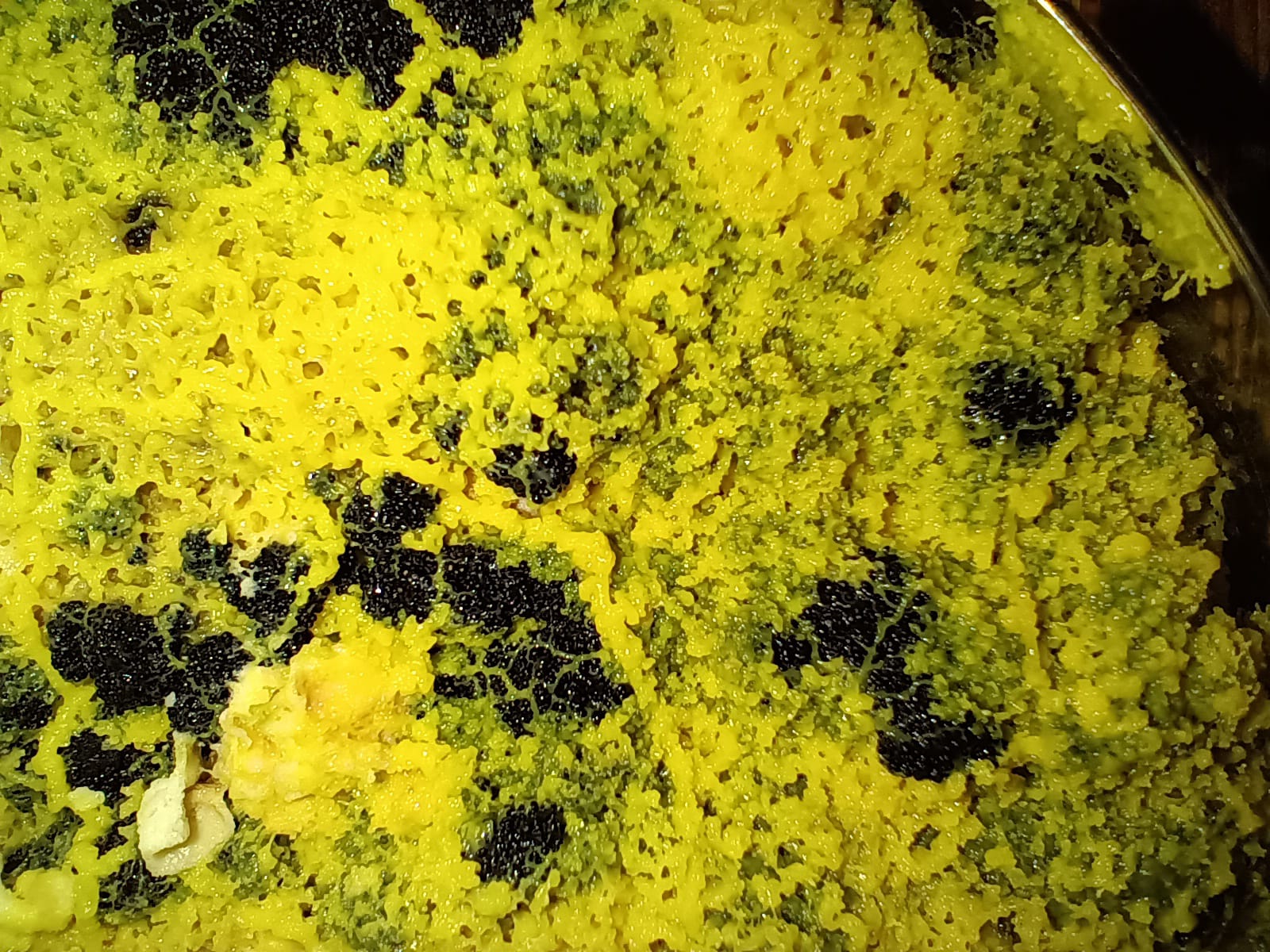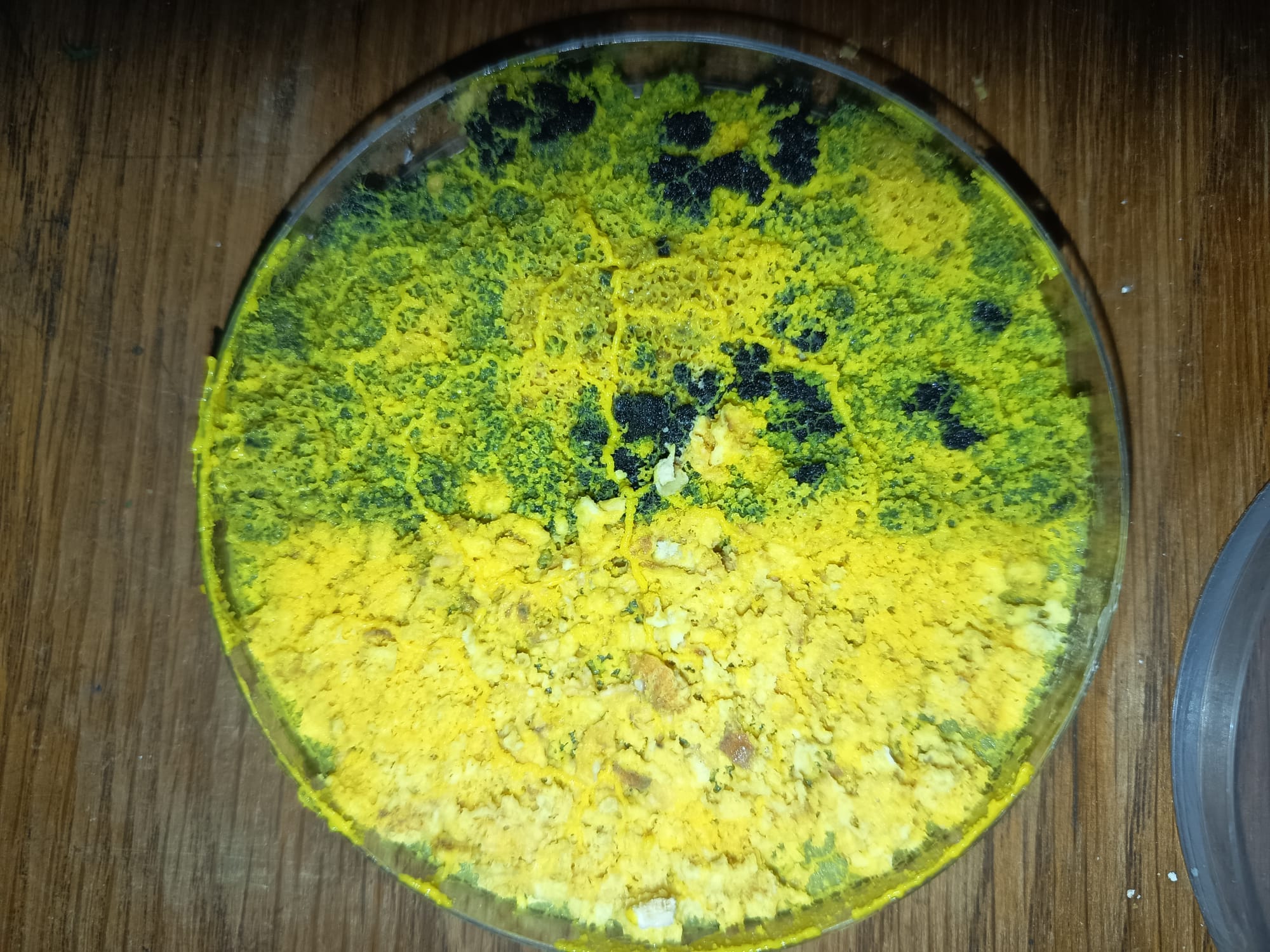 Une partie a été gardée en extérieur, avec des températures avoisinant des températures négatives sur plusieurs jours. Il a résisté. De l' eau s' est finalement infiltrée sur plusieurs centimètres de hauteur dans les boîtes gardées en extérieur et malheureusement, cette fois, c' était la fin pour ce blob gardé dehors... Quoi que... Plusieurs jours après avoir tout laissé trempé et dans le même état, surprise : le blob refait surface et monte sur les rebord de la boîte. Nous décidons donc de tester en conditions restreinte dehors mais sans boîtes, de le conserver et de voir comment il se débrouille. Il se débrouille bien, les jours passent, il se développe moins vite ( rappelons qu' il fait entre 0°C et 6°C dehors..) mais il se développe. Mais c' est finalement sans compter sur notre poule, qui finira par manger ce blob guerrier qui avait, jusque là, résister à tout.... (Pour info : la poule va bien mais n' est pas plus intelligente..🐔Elle confirme donc le fait que la fusion et la transmission d' infos n' est possible qu' entre deux myxomycètes... )