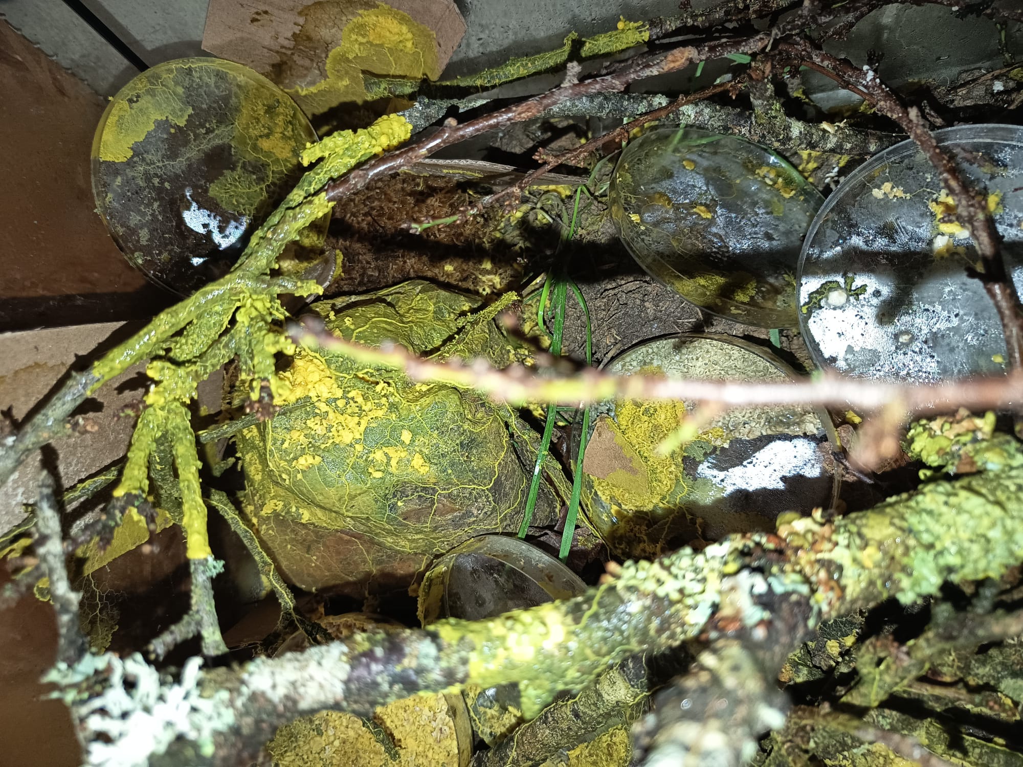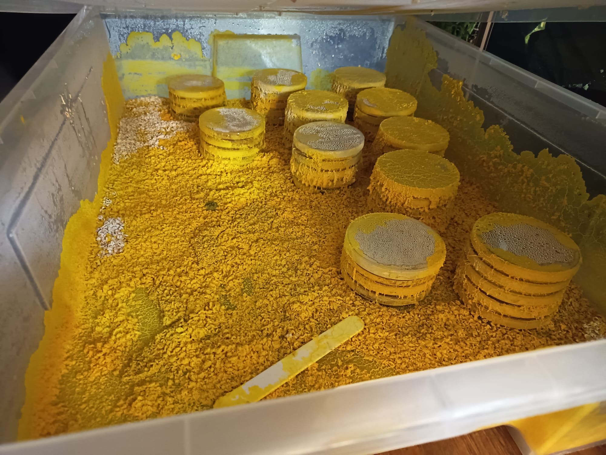 Boo DW, un Physarum polycephalum (DW) a été cultivé/élevé en même temps dans 96 boîtes de pétri de 90mm, 10 boîtes de 30x45cm, 5 boîtes de 30x18cm, 5 boîtes de 20x3cm, 1 boîte de 105x78cm, 1 terrarium de 60 x 35 x 35xm et 1 terrarium de 45 x 45 x 60cm.